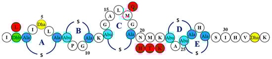 Primary structure of nisin A. Residues are represented in the single letter code. Post translational modifications are indicated as follows, Dha: dehydroalanine, Dhb: dehydrobutyrine, Abu: 2-aminobutyric acid, Ala-S-Ala: lanthionine, Abu-S-Ala: 3-methyllanthionine. Amino acid substitutions nisin A T2L, nisin A M17Q and nisin A HTK are highlighted in red.