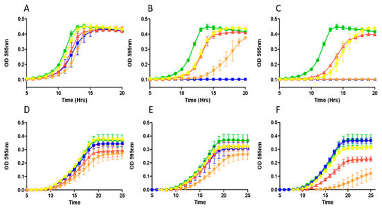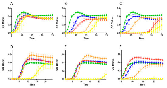 Impact of increasing concentrations of nisin A and nisin derivatives on growth of lactococci. Effect of nisin A (blue square) and nisin variants nisin A M17Q (orange triangle), nisin A HTK (red triangle) and nisin A T2L (yellow diamond) and untreated control (green circle) on L. lactis KH in 0.14 µg/mL (A), 0.32 µg/mL (B) and 0.64 µg/mL (C) and L. lactis IP5 in 0.16 µg/mL (D), 0.32 µg/mL (E) and 0.48 µg/mL (F). The means and standard deviations of three independent determinations are presented.