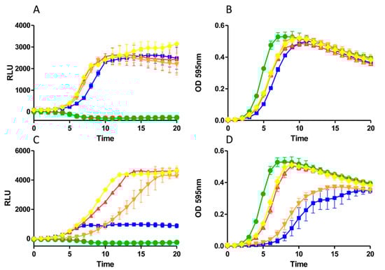 Indeed, the rate of expression, and thus induction, appeared identical for all peptides tested with a maximum intensity achieved after 10 h. Similarly, little impact on growth of the strains at this peptide concentration was observed when compared with the uninduced control (Figure 4B) and was in agreement with previous findings []. However, when the higher concentration of 30 ng/mL was applied, a significant impact on the rate and level of GFP expression was detected for nisin A (Figure 4C). In contrast, the variant peptides induced higher intensities of fluorescence than at 10 ng/mL, though the rate was more elongated and the maximum intensity achieved was at 12, 14 and 18 h for nisin A HTK, nisin A T2L and nisin A M17Q, respectively. When the growth profiles of the strains were examined, nisin A proved inhibitory to growth as evidenced by a lengthy lag phase (Figure 4D). The M17Q derivative also elicited a delay in bacterial growth, which coincided with delayed expression of GFP. In contrast, it was clearly evident that both nisin A HTK and nisin A T2L had only a minimal impact on the growth and consequently GFP expression of the reporter strain, further supporting previous MIC and growth curve outcomes with the other lactococcal strains tested.