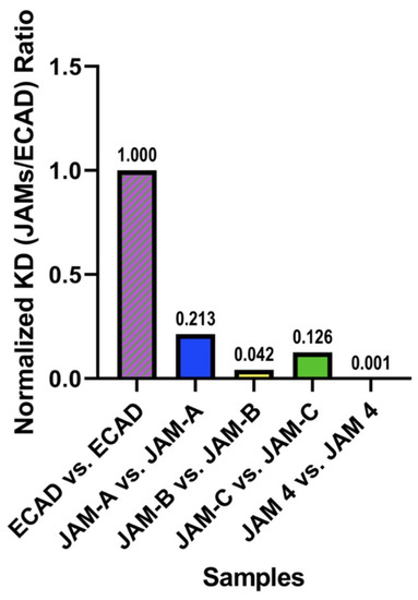 Vendome and colleagues [27], discussed the formation of homotypic interactions in the case of E-CAD. While exploring affinity constants obtained by multiple methods (SPR and analytical ultracentrifugation) the authors conclude that rather than obtaining absolute values, they observed that the data are in agreement of the behavior of E-CAD. Vendome and colleagues explain that each technique offers enough differences to produce unequal values even when measuring the same properties of the same protein [27]. Our research strategy circumvented this paradigm by measuring both E-CAD and JAMs’ protein–protein interactions using SPR, with E-CAD values serving as a standard parameter. Finally, rather than interpret the absolute value determined by SPR, we normalized the values presented (affinity constant, KD) to that of the better studied E-CAD. In addition to the comparison of protein–protein interactions, normalizing KD to that of E-CAD enables a simple estimation of the adhesion contributions of the AJ and the TJ to the intercellular interactions.