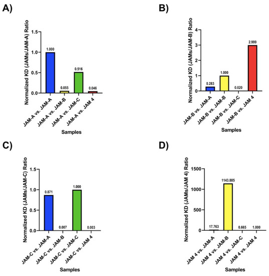 SPR for each run was performed 3 times per sample, and analyzed by using the TraceDraw software (Kitcherner, ON, Canada) according to the suggestions by Nicoya (Kitchener, ON, Canada). The data in Figure 3 were normalized by using the KD values of each combination run (samples) by dividing each by the E-CAD vs. E-CAD KD value. For Figure 4, we normalized the heterotypic KD values with that of the homotypic interaction for each JAM protein. Thus, all heterotypic interactions of JAM-A were normalized to the KD value of the homotypic JAM-A interaction. We performed a similar analysis with JAM-B, JAM-C and JAM4.