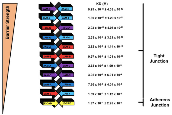 Finally, our work might shed light on the fundamental question of why there are four different JAM proteins and what their specific roles are in the formation of tight junctions in specific tissues. The tissue-specific expression of JAMs is only partially known, but well established in other tissues. Our evidence suggests a greater role of JAMs in permeability than previously suggested [40,44]. Based on our findings, heterotypic interactions could result in stronger intercellular interactions, leading to further control of the TJ permeability, thus conforming to the tissue homeostatic needs. We might imagine a scenario in which there needs to be an interaction of the most hydrophobic JAMs, either homo- or heterotypic, to regulate permeability in tissues such as the blood–brain barrier. Such a scenario can be responsible for the trafficking of ions, water and other hydrophilic molecules through the tight junction barrier. Opposite to the blood–brain barrier is the case of the kidney, where certain regions support the reabsorption of ions and water. In this case, control of the tight junction’s permeability may rely on JAM expression of the less hydrophobic JAMs, such as JAM-A. Future work would investigate these ideas, and what is clear from our research is that there is a difference in how these JAMs oligomerize, and that they form homotypic and heterotypic interactions. Understanding these differences may result in unveiling the specific inner workings in tight junctions and its control of the paracellular permeability. In Figure 5, we summarize the homotypic and heterotypic interactions of JAMs, and rank them according to their strength, or in other words, the strong adhesive contributions to the tight junction.