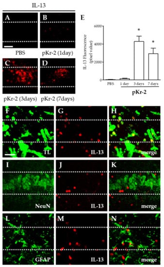 Endogenous expression of IL-13 in the CA1 layer of pKr-2-injected hippocampus in vivo. PBS (A) or pKr-2 (B–D,F–N) was unilaterally injected into the CA1 layer of rat hippocampi. At indicated time points, animals were transcardially perfused and brains were prepared for immunohistochemical staining. (A–E) Immunofluorescence images of endogenous interleukin-13 (IL-13) (A–D) and quantification (E) in the CA1 layer of rat hippocampus at indicated time points. Scale bar, 40 μm. * p < 0.001, significantly different from PBS (control). Mean ± SEM; n = 4 to 6 in each group, ANOVA and Newman–Keuls analysis. (F–N) Double immunofluorescence images of tomato lectin (TL; F, green) for microglia/macrophages and neutrophils and IL-13 (G, red) or NeuN (I, green) for neurons and IL-13 (J, red) or glial fibrillary acidic protein (GFAP; L, green) for astrocytes and IL-13 (M, red) and both images are merged (yellow, H,K,N) in the CA1 layer of hippocampus at 12 h after pKr-2 injection. Scale bar, 25 μm. These data are representative of four to five animals per group. Dotted lines indicate the CA1 layer of the hippocampus.