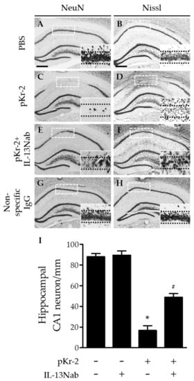 IL-13 contributes to neurodegeneration in the CA1 layer of hippocampus in vivo. PBS (A,B) or pKr-2 was unilaterally injected into the CA1 layer of hippocampus in the absence (C,D) or presence of IL-13 neutralizing antibody (IL-13Nab; E,F; 1 μg). Non-specific IgG (1 μg; G,H) was used as a control of IL-13Nab. Animals were transcardially perfused and brains were prepared for NeuN immunostaining and Nissl staining at 7 days after pKr-2 injection. (A,C,E,G) NeuN immunostaining to identify neurons in the CA1 layer of hippocampus. Scale bar, 500 μm. (B,D,F,H) Nissl substance was stained in the CA1 layer of hippocampus. Scale bar, 500 μm. (I) Quantification of NeuN-immunopositive (NeuN+) cells in the CA1 layer of pKr-2-injected hippocampus. * p < 0.001, significantly different from PBS (control). # p < 0.001, significantly different from pKr-2. Mean ± SEM; n = 4 to 6 in each group, ANOVA and Newman–Keuls analysis. Insets are magnified from rectangles and dotted lines indicate the CA1 layer of the hippocampus (A–H).