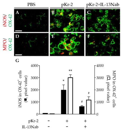 Activated microglia/macrophages and neutrophils produce inducible nitric oxide synthase (iNOS) and myeloperoxidase (MPO), which induces oxidative/nitrosative stress, resulting in neurodegeneration [4,16]. Thus, we examined whether intrahippocampal injection of pKr-2 induced expression of iNOS and MPO in activated microglia/macrophages and neutrophils. pKr-2 (48 μg) or PBS as a control was unilaterally injected into the CA1 layer of the hippocampus of rats. Three days later, immunohistochemical analysis showed that pKr-2 significantly increased expression of iNOS (Figure 4B,G) and MPO (Figure 4E,G) within OX-42+ microglia/macrophages and neutrophils, respectively, compared to PBS-injected control (Figure 4A,D,G). To verify involvement of iNOS and MPO with IL-13-induced neurotoxicity, IL-13Nab was unilaterally co-injected with pKr-2 into the CA1 layer of hippocampus. Three days later, immunohistochemical analysis demonstrated that treatment of IL-13Nab significantly reduced pKr-2-triggered expression of iNOS (Figure 4C,G) and MPO (Figure 4F,G).