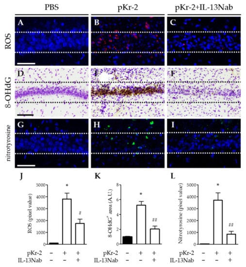 We hypothesized that oxidative/nitrosative stress as a result of IL-13-stimulated expression of iNOS and MPO contributes to pKr-2-induced neurodegeneration in hippocampus in vivo. To test this, we investigated whether IL-13Nab altered the effects of pKr-2 on oxidative/nitrosative stress by analyzing levels of reactive oxygen species (ROS) (O2− production), DNA oxidation, and protein nitration at 3 days post pKr-2. For O2− production, oxidized hydroethidine (red fluorescent products) was analyzed by hydroethidine histochemistry. As a result, pKr-2 injection correlated with increased O2− production in CA1 layer of hippocampus in vivo (Figure 5B,J), compared to PBS-injected control (Figure 5A,J). By contrast, treatment of IL-13Nab significantly reduced pKr-2-triggered O2− production (Figure 5C,J). For DNA oxidation, we measured the levels of 8-OHdG at 3 days post pKr-2. Immunohistochemical analysis showed pKr-2-stimulated increase in levels of 8-OHdG (Figure 5E,K) compared to PBS-injected control (Figure 5D,K). Treatment with IL-13Nab significantly attenuated pKr-2-increased levels of 8-OHdG (Figure 5F,K). For protein nitration, analysis by nitrotyrosine immunohistochemistry revealed pKr-2-stimulated increase in protein nitration (Figure 5H,L) compared to PBS-injected control (Figure 5G,L). Treatment with IL-13Nab dramatically mitigated pKr-2-stimulated increase in levels of nitrotyrosine (Figure 5I,L).