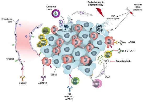 From an immunological point of view, the CNS draws specificities in the well described cancer immunity cycle []. First of all, the blood–brain barrier (BBB) limits the interactions between the two compartments that can limit cell migration from blood to the CNS. Nevertheless, we now have robust data proving the T cell efflux to the CNS, particularly through the α4β1 integrin []. Moreover, cytokines can transiently open the BBB, such as nitric oxide (NO) or tumor necrosis factor (TNF), and GBM can also locally disrupt the BBB []. Still, physical factors such as the antibody (Ab) size need to be taken into account for optimal drug delivery [], even though radiolabeled Abs are clearly shown to locate at the tumor site, such as in brain metastasis []. Secondly, the CNS lacks conventional draining lymphatics, but evidence points towards adapted drainage to deep cervical lymph nodes [,]. Conventional dendritic cells (DCs) are also missing in the brain parenchyma, which is populated by an important proportion of microglia cells that can also present antigens []. Still, the GBM tumor microenvironment (TME) is mostly immunosuppressive due to the high proportion of myeloid cells, such as tumor associated macrophages (TAMs), and, particularly, the M2 phenotype highly represented in GBM []. M2 TAMs have pro-tumoral activity through the secretion of immunosuppressive molecules such as transforming growth factor β (TGFβ), interleukin 10 (IL-10), vascular endothelial growth factor (VEGF), or matrix metalloproteinase (MMP)-2 and MMP-9 []. TAMs are an active field of research, and are also described to be unpolarized with an M0 phenotype, and therefore would represent an ideal target for reprogramming []. GBM cells can also secrete TGFβ that can further induce regulatory T cells (Tregs), which amplifies the immune suppression []. The enzyme indoleamine-pyrrole 2,3-dioxygenase (IDO) is another suppressive factor in the GBM TME that will degrade tryptophan, an amino acid needed to promote T cell growth and survival []. Taken together, immunological specificities of the CNS, characteristics of the GBM tumor itself, and the TME lead to an unfavorable immune state with sparse T cell infiltration [,,], which can classify GBM as an immunologically cold tumor.