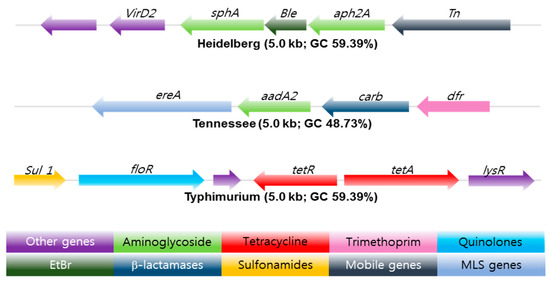 Antibiotic resistance gene clusters of three common Salmonella serotypes found in swine isolates from 2004–2005. EtBr resistance gene (Dark Green) flanked by antibiotic resistance genes marked in light green. The arrow shows the orientation of the genes; genes are color-coded to define different classes of antibiotic resistance, mobile, and other gene categories. Copyright permission PLOS One [45].