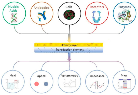 Schematic of a biosensor. Reading from the top down; A tailored affinity layer specific to an analyte or analytes. Binding of an analyte to the layer leads to changes in its physical properties (electrochemical, optical, heat, etc.), which are converted into a measurable signal by the transduction element; these are then relayed to and recorded by an electronic meter or visually (coloration) identified by the subject. Figure reproduced with permission from Elsevier [68].
