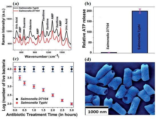 The Raman spectra of MDR Salmonella DT104 and a susceptible strain of Salmonella Typhi (a) on the heterostructure surface. Plots indicating the percentages of live bacteria for Salmonella DT104 and Salmonella Typhi after treatment with the (b) Augmentin antibiotic at 1000 CFU/mL. Plots showing the relative cellular ATP leakage from Salmonella DT104 and Salmonella Typhi after treatment with the Augmentin (c) antibiotic. An SEM image showing the damaged walls of Salmonella Typhi (d) after treatment with the Augmentin antibiotic. Figure modified with permission from [87]. (Copyright 2020, American Chemical Society).