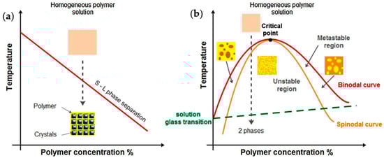 TIPS process in polymer solutions through two main mechanisms: (a) solid-liquid phase separation, (b) liquid–liquid phase separation. Reprinted with permission from [].