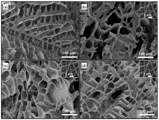 SEM micrograph of the prepared scaffolds. PCL/PLA/GNF (a), PCL/PLA/GNF/Tau 0.1% (b), PCL/PLA/GNF/Tau 1% (c) and PCL/PLA/GNF/Tau 10% (d). The insets show SEM micrograph of GNFs. Reprinted with permission from [].