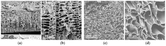 SEM images exhibiting the cross-sectional structure obtained from PCL (a,b) and PEUU (c,d) scaffolds prepared using same TIPS experimental conditions (i.e., solvent, polymer concentration, cooling and drying conditions). Reprinted with permission from [].