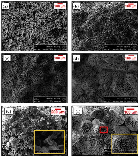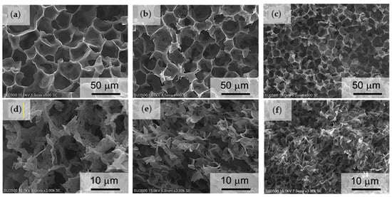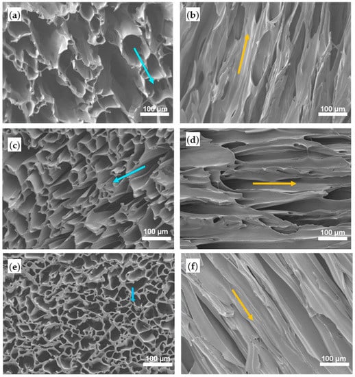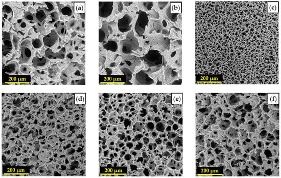 SEM micrographs of PLLA scaffolds obtained by TIPS according to a slow cooling for 30 min and demixing temperatures of 25 °C (a) and 30 °C (b), and a fast quenching (c). The average pore sizes were 100 μm, 150 μm and 25–30 μm, respectively. By keeping the demixing temperature at 20 °C for 15 min and using/not using an insulating PTFE shell (COAT/NOCOAT) in TWB and/or in EAB, (d) COAT-NOCOAT; (e) NOCOAT-COAT; (f) COAT-COAT. The average pore sizes were about 30 μm, 40–50 μm and 60 μm, respectively. Reproduced with permission from [].