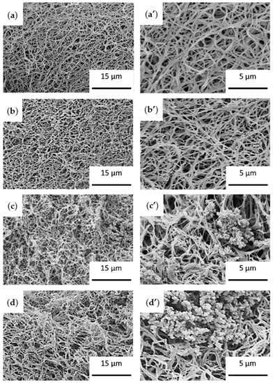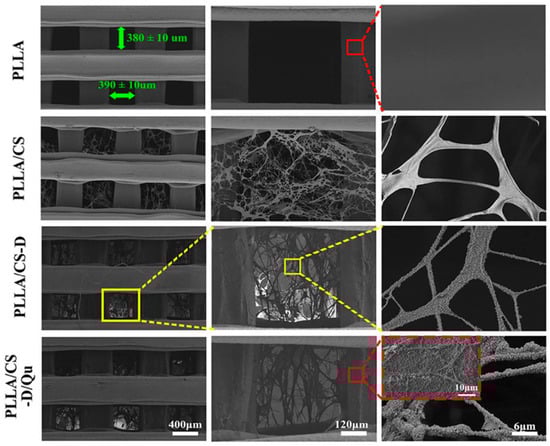 However, combination of 3D printing and TIPS technologies can overcome the indicated limitations. Specifically, through TIPS technique, scaffolds consisting of CS nanofibres within 3D printed PLLA microfibres were produced. The resulting hierarchical structure consisted on irregular CS nanofibres, with diameters around 80–600 nm, which were infiltrated into the holes and the surfaces of the PLLA microfibres. These PLLA/CS scaffolds were finally covered with a polydopamine (PDA) layer (PLLA/CS-D) and then functionalized with bioactive quercetin (Qu) (PLLA/CS-D/Qu). The CS nanofibres were not structurally affected by PDA and Qu surface modification (D/Qu) and maintained their original structure. Field emission scanning electron microscope (FESEM) images of unmodified and modified PLLA scaffolds are shown in Figure 6. Incorporation of CS nanofibres, PDA and Qu increased the hydrophilicity and mechanical properties of the neat PLLA scaffold and promoted cell growth and adhesion into the internal pores. Furthermore, an excellent osteogenic activity and anti-inflammatory response conferred an attractive prospect for bone tissue engineering [].