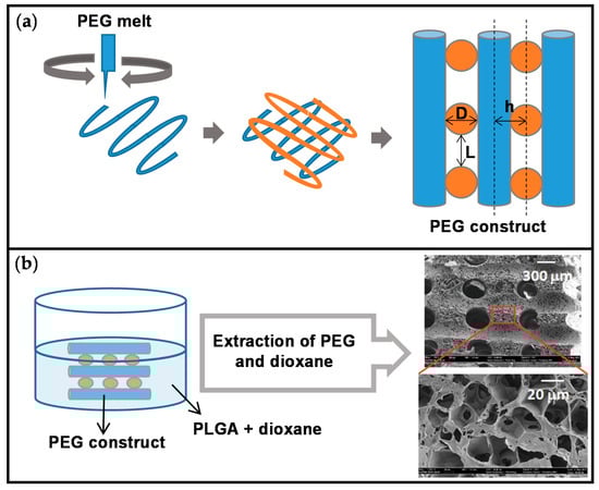 AM bioplotting of PEG constructs and adjustable bioplotting parameters (a). Schematics of the fabrication process of a simple PLGA scaffold derived from the previous incorporation of PEG macrofibres (b). D,L and h represent strand diameter, pore size and layer thickness, respectively. The successive PEG layers (blue and orange) have perpendicularly been 3D-plotted. Based on [].