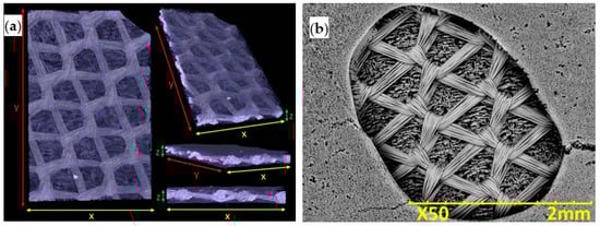 Micro-computed tomography (MicroCT) images of a TIPS-obtained PLGA scaffold incorporating PLGA knitted mesh (a) and a SEM image showing the porous TIPS structure and the embedded PLGA mesh through a rare spontaneous bubble (b). X, Y and Z are the scaffold dimensions. Reproduced with permission from [].