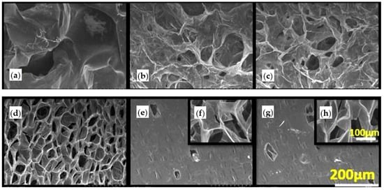 SEM morphologic observations of pure Col (a), pure CS (g,h) and CS/Col scaffolds with wt% ratios of: 10/90 (b), 50/50 (c), 70/30 (d) and 90/10 (e,f), respectively. All micrographs have the same magnification as well the two insets. Reproduced with permission from [].