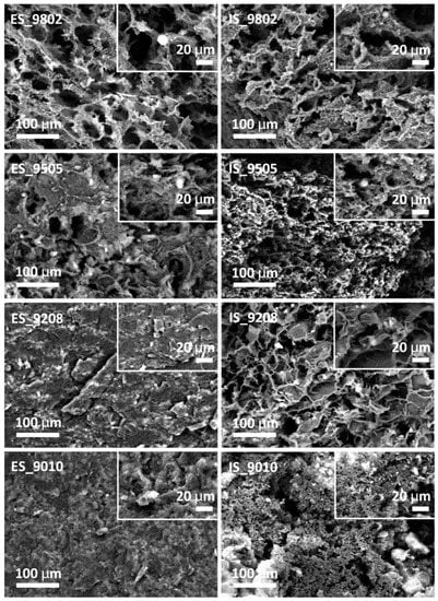 Si et al. [] fabricated for example porous CS/Col scaffolds with controlled degradation behaviour by TIPS. These natural-based blend polymer scaffolds were employed as a potential support matrix for peripheral nerve regeneration. Different polymer solutions with different volume ratios (ranging from 10–90%) of CS and Col in acetic acid, and pure CS and Col solutions as control were processed. Pore size, degradation rate and mechanical properties of the resulting scaffolds could be tuned by changing the ratio of the two components. Thus, the increase in CS content led to a decrease of the mean pore size, liquid uptake and degradation rate, while improved mechanical properties. Morphological evaluations showed fibre-like structure with an interconnected network in pure Col scaffolds and those with low CS content, while this structure gradually disappeared and changed into a cobblestone-like structure when the CS content reached 90% (Figure 9).