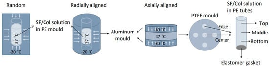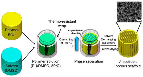 All these advancements have enabled researchers to produce a variety of architectures and pore morphologies in micro/nanometer scale, desirable for specific utilizations. Porous scaffolds with architectures identified as micro/macro-porous [,,], fibrillar (nano/micro-fibrous) [,,,,], isotropic (random-pore) [,,,,], anisotropic (oriented/aligned-pore or microtubular) [,,,,,], bilayered [,,], biphasic [,] structures, lamellar platelets, lamellar stacks, axialites, spherulites [] or a mixture of these structures have recently been produced by TIPS or TIPS-based strategies.
