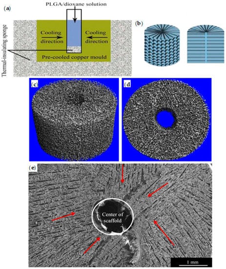 Chen et al. synthesized PLLGC terpolyester by melt copolymerization process and then utilized it for preparation of porous scaffolds by TIPS technique. By varying some TIPS processing parameters like polymer concentration (from 2.5 to 15 wt%) and freezing temperature (from 4 to −60 °C) structural and mechanical properties could be controlled. Results showed larger pores and higher porosity, but a lower compressive strength when the polymer concentration was decreased, or the freezing temperature was increased. Furthermore, regular and interconnected pore structures with uniform pore size was achieved, although at high polymer concentration some pores were linear with uneven distribution and inconsistent pore sizes. The decrease in the freezing temperature caused a structural change from an irregular pore distribution to an orientated micro-tubular structure. Changes could be justified considering the crystallization of the employed 1,4-dioxane solvent throughout the phase separation process and the influence of the temperature gradient, which is more significant at lower freezing temperatures [].