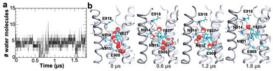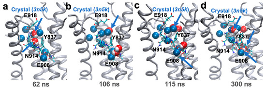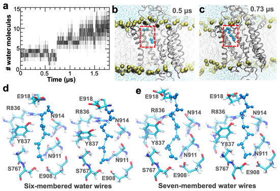 4.2. Simulation of the Protonated E2 State to Establish the Presence of Water Wires in the C-Terminal Pathway