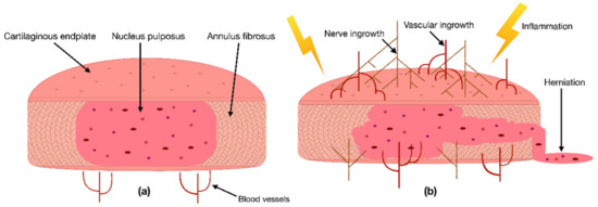 Due to the IVD’s avascular nature, its cells depend on the blood vessels’ nutritional supply at the IVD margins [17]. Hence, a reduction in the supply of nutrients has been correlated with IDD [18]. This cut of essential nutrients can be caused by blocked capillaries near the IVD or calcified CEPs, preventing the supplements from properly diffusing into the IVD [17]. Consequently, a lack of nutrients can be responsible for changes in the IVDs catabolic and anabolic turnover, cause dehydration, and lead to an aberrant production of pro-inflammatory cytokines [19,20]. As a result, these cytokines can initiate inflammation, promote vascular and nerve ingrowth into the IVD, induce pain, or even increase the risk of herniation (Figure 1) [20,21,22,23]. In addition to the lack of nutrient diffusion into the IVD, other risk factors such as excessive mechanical stress, smoking, trauma, and unfavorable genetic predispositions have been correlated with IDD [1]. In the past, multiple studies have confirmed that many signs of IDD, i.e., an anterior or posterior bulge of the IVD, an insufficient blood supply, or a decreased signal intensity of the NP in a T2-weighted image, are correlated with an increased risk of developing LBP [18,24]. Nevertheless, the exact cause of IDD and its relation to LBP are still under investigation.