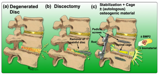 There are many options to treat LBP, yet none of them come without any drawbacks or limitations. Acute or subacute conditions are usually treated non-invasively and preferably non-pharmacologically [25]. Recommended therapies include acupuncture [26,27], physical therapy [28], exercise or superficial heat [29]. Additionally, for patients who suffer from chronic LBP, non-pharmacological treatments are usually considered first [25]. If these treatment options fail to reduce symptoms, pharmacological therapies are considered. They include the application of non-steroidal anti-inflammatory drugs (NSAIDs), acetaminophen, or opioids [29]. Nonetheless, in the case of inadequate response to conservative therapies, more invasive interventions are often required. Currently, the “gold-standard” surgery to treat chronic LBP associated with IDD is a discectomy, followed by spinal fusion [30]. In brief, the degenerated IVD is removed, and the cavity between the adjacent vertebral bodies is replaced by a cage containing bone grafts or substitutes that can be supplemented with osteogenic inductive growth factors such as bone morphogenetic protein 2 (BMP2) to induce ossification [31,32]. Then, pedicle screws are inserted to improve the mechanical stability and to immobilize the adjacent vertebral bodies (Figure 2) [33].