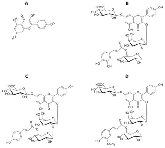Chemical structures of kaempferol and its derivatives isolated from Lens culinaris Medik. (A) Kaempferol; (B) kaempferol 3-O-[(6-O-E-caffeoyl)-β-D-glucopyranosyl-(1→2)]-β-D-galactopyranoside-7-O-β-D-glucuropyranoside (P2); (C) kaempferol 3-O-[(6-O-E-p-coumaroyl)-β-D-glucopyranosyl-(1→2)]-β-D-galactopyranoside-7-O-β-D-glucuropyranoside (P5); (D) kaempferol 3-O-[(6-O-E-feruloyl)-β-D-glucopyranosyl-(1→2)]-β-D-galactopyranoside-7-O-β-D-glucuropyranoside (P7).