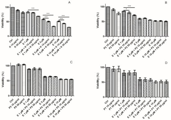 Viability of HL-60 cells determined by resazurin reduction assay after 24 h treatment with 1–10 µM etoposide (E) and 10-50 µg/mL kaempferol (K) (A), P2 (B), P5 (C) and P7 (D) derivatives. The figure shows mean results ± SD, n = 6; * p < 0.05, *** p < 0.001.