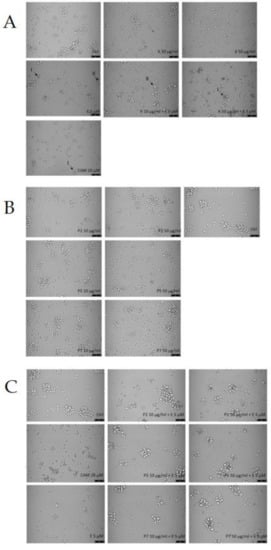 Next, we tested the level of DNA damage following exposure to kaempferol derivatives and etoposide. Previously, we showed that kaempferol alone induced DNA damage in HL-60 cells as well as increased DNA damage induced by etoposide []. Coincubation of HL-60 cells with 1 µM etoposide and 50 μg/mL kaempferol increased the level of DNA damage from 27.5% to 39.6% (p < 0.001). Here, we did not observe any changes in the level of DNA damage induced by etoposide in HL-60 cells incubated with the two tested kaempferol derivatives (P2 and P5) (Figure 4). Figure 5 shows representative photos of the comets obtained after the incubation of HL-60 cells with these kaempferol derivatives (10–50 µg/mL) and 1 µM etoposide. The data are consistent with our previous results for two other kaempferol derivatives isolated from Lens culinaris Medik. [].