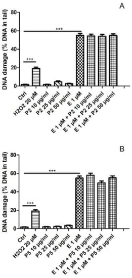DNA damage, measured as the comet tail DNA (%) of HL-60 cells incubated for 2 h at 37 °C with P2 (A) and P5 (B) derivative (10–50 µg/mL) and 1 µM etoposide (E), analyzed by the alkaline comet assay. The figure shows mean results ± standard error of the mean (SEM), n = 100; *** p < 0.001.