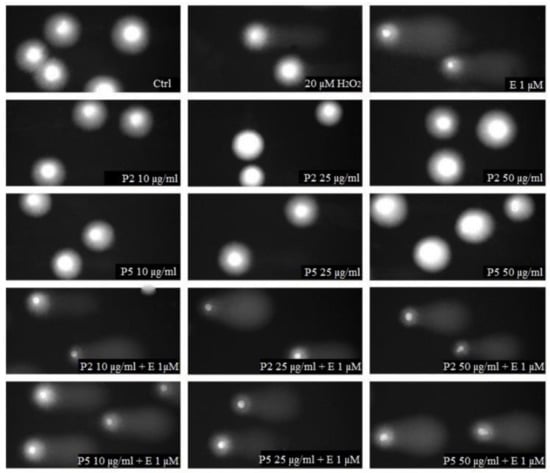 Representative pictures of comets obtained in the alkaline version of the comet assay after incubation of HL-60 cells with 10, 25 or 50 µg/mL P2 and P5 kaempferol derivatives and 1 µM etoposide (E). The figure also contains pictures of comets from negative control (Ctrl) and positive control (cells incubated with H2O2 at 20 µM for 15 min on ice).