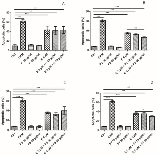 Apoptosis measured by flow cytometry using a double staining of FITC Annexin V and propidium iodide in HL-60 cells incubated for 24 h at 37 °C with 5 µM etoposide (E) and 10 or 50 µg/mL kaempferol (K) (A), P2 (B), P5 (C) and P7 (D) derivatives. The cells incubated with 20 µM camptothecin (CAM) for 24 h at 37 °C were positive control. The figure shows mean results ± SD, n = 3; * p < 0.05, 0.01, *** p < 0.001.