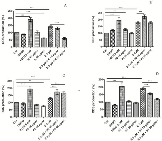 Reactive oxygen species (ROS) level in HL-60 cells incubated for 24 h at 37 °C with 5 µM etoposide (E) and 10 µg/mL or 50 µg/mL kaempferol (K) (A), P2 (B), P5 (C) and P7 (D) derivatives. The cells incubated with 5 mM H2O2 for 15 min at 37 °C were positive control. The figure shows mean results ± SD, n = 6; ** p < 0.01, *** p < 0.001.