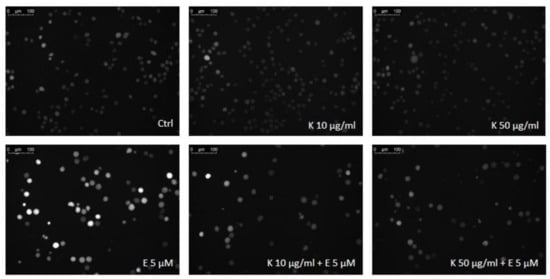 Representative photos of cells with 20 the fluorescence probe H2DCFH-DA after 24 h incubation at 37 °C with 5 µM etoposide (E) and 10 µg/mL or 50 µg/mL kaempferol (K). The figure also contains pictures of comets from negative control (Ctrl).