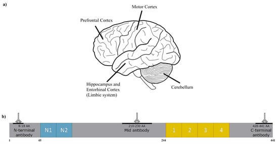 Schematic of the brain regions examined, and the antibodies used to probe Tau. (a) Diagrammatic representation of the human brain with the regions highlighted. As illustrated, both the hippocampus and entorhinal cortex are internal. (b) Schematic of the Tau 441 isoform with highlighted antibody epitope recognition sites.