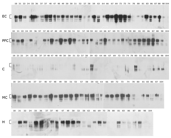 Insoluble fraction. The mid-sequence antibody typically gave rise to bands of a molecular weight corresponding to four of the six known Tau isoforms (Figure 2). Since all six isoforms of Tau were detected when a commercial Tau protein ladder was employed with this antibody, these data suggest that the lack of detection of two Tau isoforms in human samples was due to the modification of some epitopes [40], or that two Tau isoforms are present at much lower levels in the human brain than the other four. This pattern was similar in all brain regions examined (PFC, H, MC, EC), with the exception of the cerebellum, which displayed fewer bands than the other brain regions. The cerebellum also showed an apparent age-dependent trend with two lower molecular weight (MW) immunoreactive Tau bands at ~45 kDa and 40 kDa dominating, particularly from age 80 onwards (Figure 2). These two bands were also present in some other brain regions.