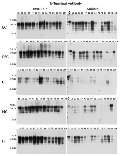 The N-terminal antibody blots were generally more reproducible in pattern between the donors across the age range (Figure 4). The N-terminal antibody also allowed for a better visualisation of low-molecular-weight (LMW) Tau fragments (below 50 kDa) that were evident at an early age (Figure 4). These Tau fragments ranged in apparent mass from 30 to 37 kDa in the insoluble fraction, and from 25 to 37 kDa in the soluble fraction. Most fragments appeared to be of the same size, based on mobility, in the insoluble and soluble brain fractions, although a greater number of truncated Tau species were present in the soluble fraction. This was particularly noticeable in the cortical brain regions where several low MW bands (~25 kDa and 28 kDa) were observed.