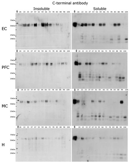 The blots of the soluble fractions were instructive. In the cortical regions of the brain, several LMW immunoreactive bands were observed (Figure 5), and these were particularly evident in the PFC and MC. These Tau fragments were present in samples across the age range. In some donors, four LMW immunoreactive bands were detected of varying intensities, but two bands—one at ~20 kDa and one at ~17 kDa—were consistently present, particularly in the PFC and MC. These same LMW immunoreactive bands were also detected by Western blotting using another C-terminal antibody (DAKO, A0024). While exact sites of cleavage were not determined, it is of note that some fragments migrated to regions that matched known sites of truncation such as Asn 255 [25].