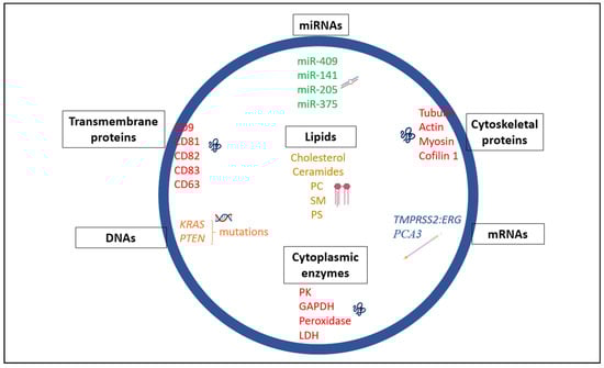Intercellular communication involving the shuttling of biological components such as microRNAs, long non-coding RNAs, DNA, and proteins via exosomes is essential in maintaining cellular homeostasis and normal functioning. However, there are instances whereby the transport of these biological substances across cells via exosomes can be detrimental resulting in pathological conditions. Over the last decade, exosomes have proven to be great export machinery in trafficking biological materials both in normal and diseased states such as in prostate cancer. Exosomes are cell-secreted and widely distributed in different biological or bodily fluids [,]. These vesicles consist of lipid bilayer membrane composed of cholesterol, phosphatidylserines, and sphingolipids which protect them against proteases and RNases [,]. Exosomes play key roles in different physiological processes, examples including erythrocyte maturation from reticulocytes, immune cell responses and also spreading of pathogens (virus and prions) from cell-to-cell [,]. In cancer, tumor-derived exosomes lead to malignancy, enhanced cell survival and proliferation, drug resistance and the creation of a PMN. The shuttling of the biological components contained in exosomes is thought to be a contributing factor to cancer development. According to Exocarta, a database for collating exosomal content, 9769 proteins, 3408 mRNAs, 2838 microRNAs and 1116 lipids have been identified in exosomes suggesting their crucial roles in intercellular communication [,,,]. Here we highlight some of the specific constituents in exosomes (Figure 1) and their key roles and functions. Also shown in Table 1 is a summary of exosomal markers that are specific to PCa and their roles.