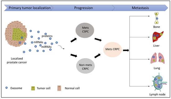 Schematic illustrating potential role of exosomes in prostate cancer progression. The release of tumor-derived exosomes enhances crosstalk across cells, leading to the progression of a localized PCa into either a metastatic Castration-Sensitive PCa (Mets CSPC) or a non-metastatic Castration-Resistant PCa (Non-mets CRPC). This ultimately leads to the advanced form of the disease; metastatic Castration-Resistant PCa (mCRPC) which can metastasize into various organs of the body such as bone, liver, lungs and lymph nodes.