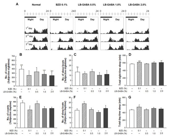 In the daytime, BZD and LB-GABA also inhibited the locomotor activity, but the reduction induced by LB-GABA was not significant. Only BZD treatment significantly decreased the daytime locomotor activity and sleep bouts (Figure 2E,F). Sleep duration was not significantly different among the groups except for that of the BZD group. (Figure 2G). This result indicated that LB-GABA did not significantly promote daytime sleep.