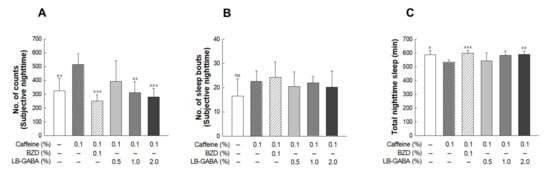 Caffeine increased sleep bouts, but the effect was not statistically significant, whereas additional BZD treatment failed to alleviate the caffeine-induced increase of sleep bouts. LB-GABA/caffeine cotreatment decreased the sleep bout, but the effect was not statistically significant (Figure 3B). The sleep duration of caffeine-treated flies was significantly lower than that of the NOR flies, but BZD and LB-GABA recovered the sleep time, and high-dose LB-GABA increased the sleep duration by approximately 11% compared with that of the caffeine-treated group (Figure 3C). This result showed that LB-GABA had a sleep-recovering effect even under caffeine-induced insomnia conditions.