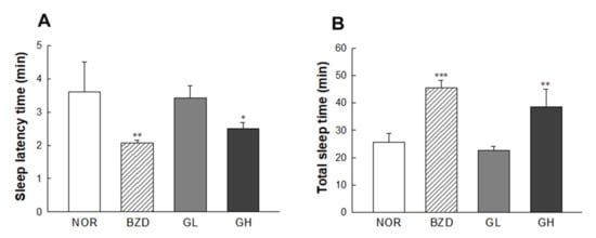The effects of LB-GABA on sleep latency and duration were determined using hypnotic doses (42 mg/kg, intraperitoneally (i.p.)). BZD and LB-GABA (GH, 100 mg/kg) treatment effectively shortened sleep latency time by 43.6% and 32.2%, respectively, compared with the NOR group (Figure 6A). This result showed that LB-GABA and BZD accelerated the onset of pentobarbital-induced sleep (Figure 6A) and increased the total sleep duration by 79% and 52%, respectively, compared with that of the NOR group (Figure 6B). This result indicated that LB-GABA effectively promoted sleep by shortening sleep latency and extending sleep duration under pentobarbital-induced hypnotic conditions.