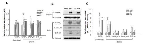 Effect of Lactobacillus-fermented γ-aminobutyric acid (LB-GABA) on mRNA and protein expressions of GABAergic and serotonergic receptors in mice. Target mRNAs and proteins from mice were analyzed via quantitative real-time PCR and Western blot, respectively. (A) mRNA expression of GABAA(intestine), GABAA(brain), GABAB-R1 and 5HT-1A receptors. (B) Protein abundances and (C) relative quantification of GABAA (intestine), GABAA(brain), GABAB-R1α/β, and 5HT-1A receptors. NOR: normal control (0.9% sodium chloride [NaCl]) group, BZD: benzodiazepine (alprazolam, 200 μg/kg)-treated group (positive control), GL and GH: low- and high-dose LB-GABA (60 and 100 mg/kg), respectively. Values are the means ± standard deviation (SD); * p < 0.05, ** p < 0.01, and *** p < 0.001 versus normal control group according to Tukey’s multiple comparison test. A.U: arbitrary unit.