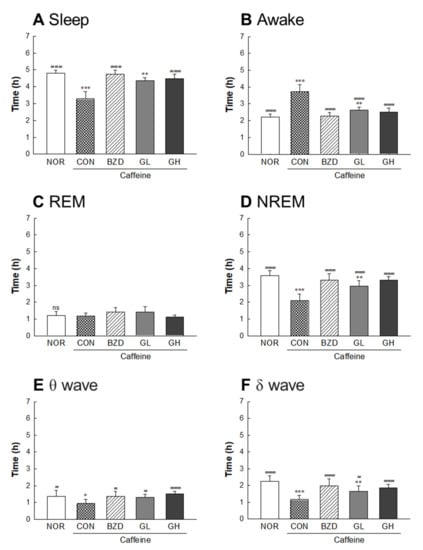 Effects of Lactobacillus-fermented γ-aminobutyric acid (LB-GABA) on electrophysiologic pattern in caffeine-induced wakefulness of rats. Caffeine (40 mg/kg) was administered as a stimulant for wakefulness before experiments. GABA was administered orally 1 h before electroencephalography (EEG) analyses, which were conducted for 3 days. (A) sleep time, (B) awake time, (C) duration of REM (rapid eye movement), (D) duration of NREM (non-rapid eye movement), (E) θ wave of NERM, and (F) δ wave of NREM.NOR: normal control (0.9% sodium chloride (NaCl)) group, CON: caffeine only treated (40 mg/kg) group, BZD: benzodiazepine (alprazolam, 300 μg/kg)-treated group (positive control), GL and GH: low- and high-dose LB-GABA (100 and 200 mg/kg, respectively) with 40 mg/kg caffeine treatment. Values are means ± standard deviation (SD); * p < 0.05, ** p < 0.01, and *** p < 0.001 versus normal group; # p < 0.05, ## p < 0.01, and ### p < 0.001 versus caffeine group according to Tukey’s multiple comparison test; ns, not significant.