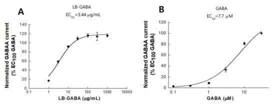 LB-GABA induced a dose-dependent increase in agonist activity at up to 30 μg/mL, indicating that, at EC100 concentrations and above (100 to 1000 μg/mL), the cell culture system was saturated and reached a plateau (Figure 10A). The EC50 of LB-GABA was determined to be 3.44 μg/mL (Figure 10A). This result showed that LB-GABA exhibited an agonist effect on the human GABAA receptor. The agonistic activity of synthetic GABA was analyzed to identify the maximal effective concentration (EC100) on the human GABAA receptor (Figure 10B). Synthetic GABA increased the current response in a dose-dependent manner within the range of 0.1 to 30 M, with an EC100 of 30 μM (Figure 10B). In addition, the half-maximal effective concentration (EC50) of synthetic GABA was calculated to be 7.7 μM (Figure 10B).