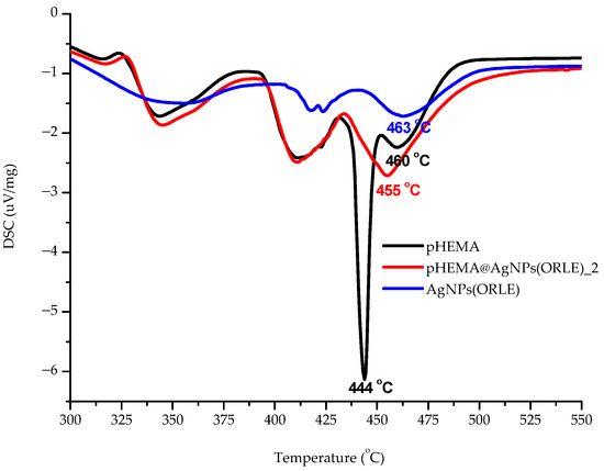 In order to clarify whether AgNPs(ORLE) interact with pHEMA in solid state leading to a mixture or a composite material, DSC studies were carried out on the powder of dry pHEMA and pHEMA@AgNPs(ORLE)_2 (Figure 3). An endothermic transition at 455.3 °C in the DSC thermo-diagram of pHEMA@AgNPs(ORLE)_2 was observed at higher temperature at 459.7°C in the free pHEMA, suggesting the formation of a composite material rather than a mixture of precursors. The formation of the composite material was further supported by the sharp endothermic transition at 443.8 °C in the diagram of pHEMA@AgNPs(ORLE)_2, which is absent in the corresponding diagrams of AgNPs(ORLE) and pHEMA, respectively (Figure 3).