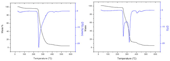 TGA diagrams of AgNPs(ORLE) (left) and pHEMA@AgNPs(ORLE)_2 (right).